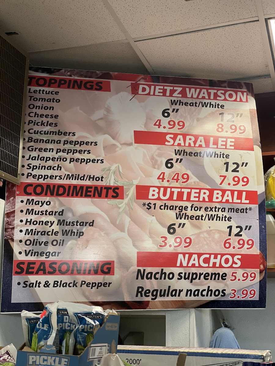 Menu highlights include a variety of deli sandwiches featuring freshly sliced meats such as turkey pastrami, served with thoughtful touches like crisscrossed mayo and mustard on fresh bread. Alongside these, simple sides like nachos — available in regular or supreme options — complement the main offerings without overwhelming the straightforward deli experience.